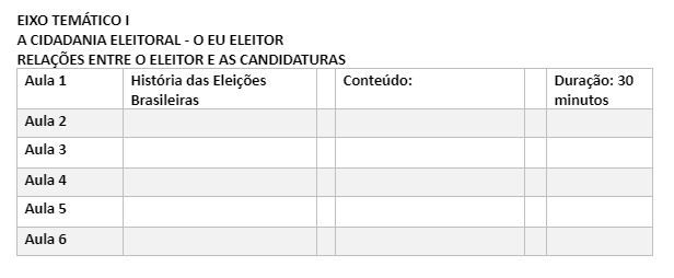 A metodologia utilizada divide o tema central CIDADANIA em três eixos temáticos; Cidadania Eleitoral, Cidadania Política e Cidadania Constitucional.